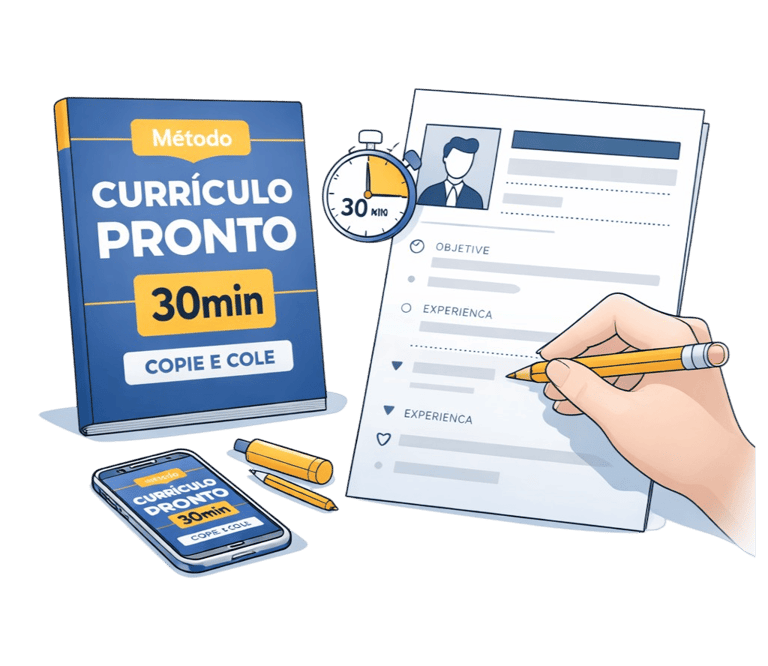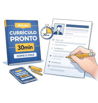 O Método Currículo Pronto 30min é um guia prático que te mostra exatamente o que escrever em cada parte do currículo.